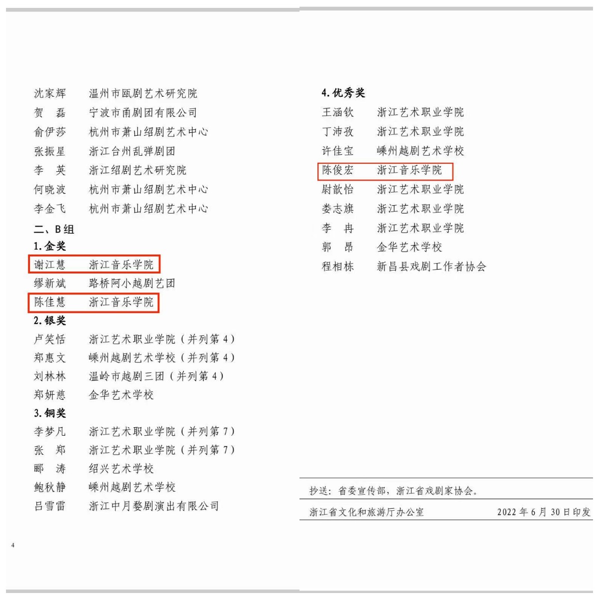 由戲劇系教師金彩芳指導,越劇演員19級學生謝江慧表演的越劇《竇娥冤·斬娥》獲得B組文戲第一,越劇演員21級學生陳佳慧表演的《焚香記·打神告廟》獲得B組文戲第三,雙雙獲得金獎,在B組三項金獎中占據(jù)兩席。由教師項衛(wèi)東指導,越劇演員20級學生陳俊宏表演的京劇《漢宮驚魂》獲優(yōu)秀獎。