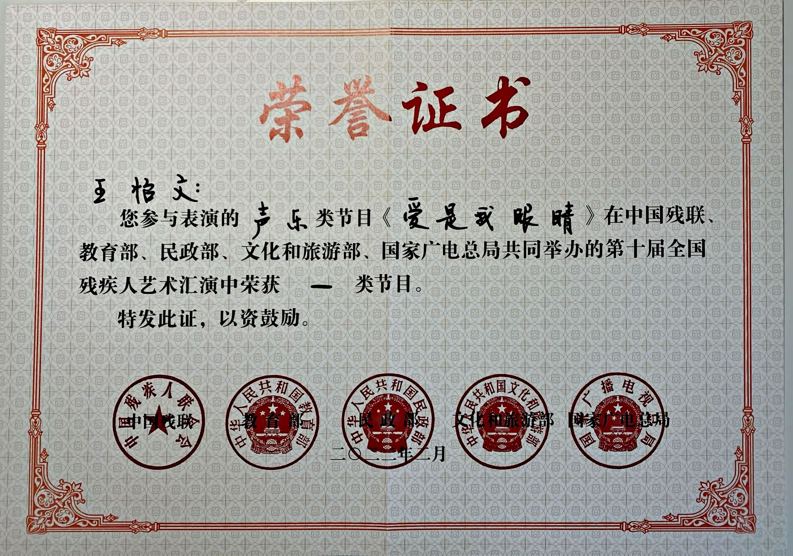 日前,由中國(guó)殘聯(lián)、教育部、民政部、文化和旅游部、國(guó)家廣電總局聯(lián)合舉辦的第十屆全國(guó)殘疾人藝術(shù)匯演圓滿落幕。學(xué)院聲樂(lè)歌劇系2019級(jí)本科生王怡文參演的聲樂(lè)類節(jié)目《愛(ài)是我眼睛》榮獲“一類節(jié)目”獎(jiǎng)項(xiàng)。
