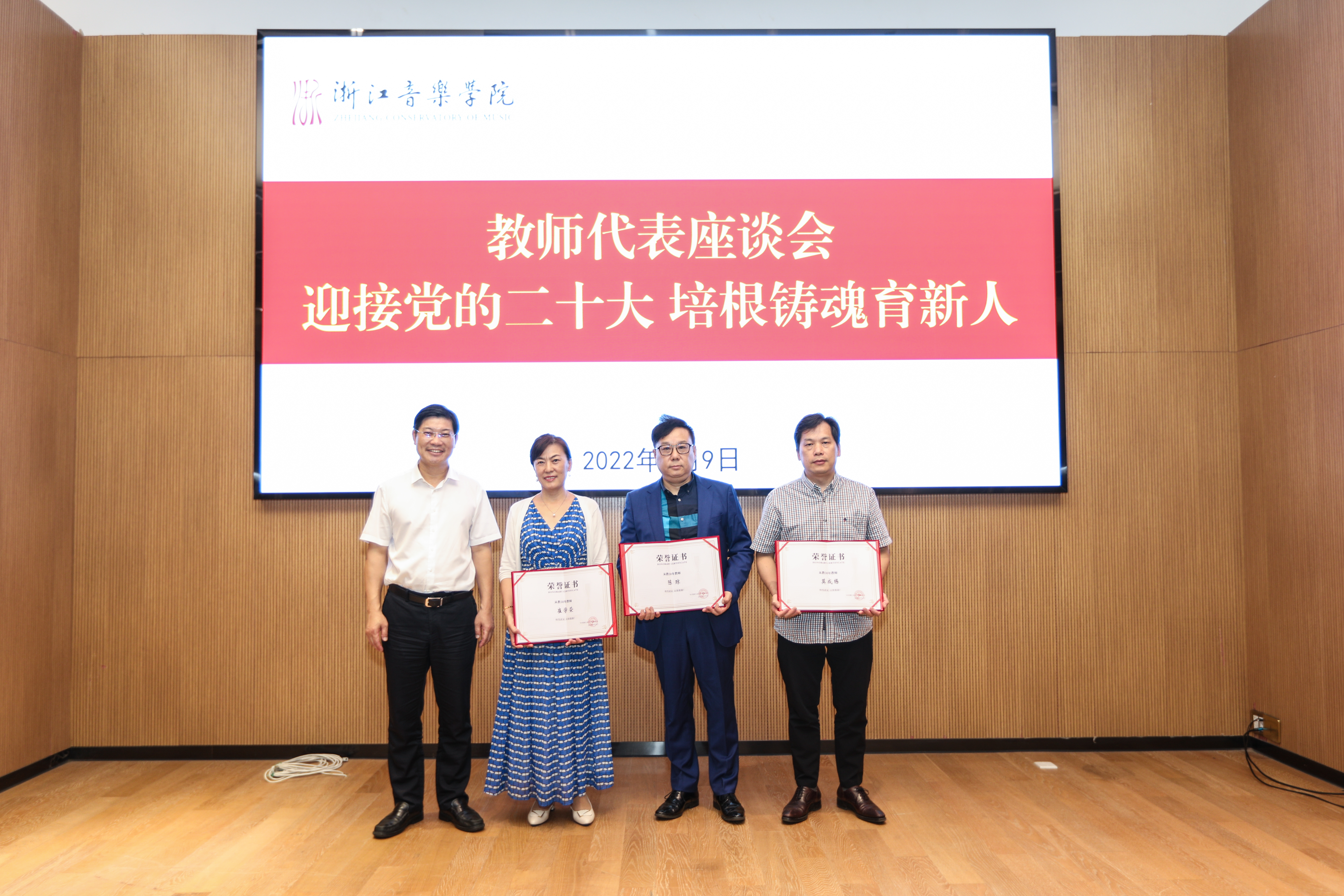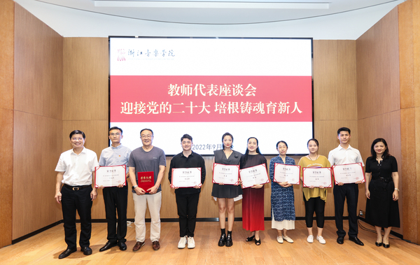 座談會(huì)上,干武東代表學(xué)院向辛勤耕耘在教學(xué)科研、藝術(shù)創(chuàng)表、管理服務(wù)等各條戰(zhàn)線上的教職員工以及為學(xué)院建設(shè)、改革、發(fā)展付出心血與汗水的退休老教師們致以崇高的敬意,對(duì)受到表彰的教師表示衷心的祝賀。他指出,教師是學(xué)院創(chuàng)業(yè)發(fā)展最寶貴的財(cái)富,是學(xué)院大家庭最可敬的園丁,是“高水平一流音樂學(xué)院”建設(shè)最重要的力量。學(xué)院要培育塑造大作、大師、大幕和大我,全面推進(jìn)“高水平一流音樂學(xué)院”建設(shè),教師隊(duì)伍是重中之重,是最重要的基礎(chǔ)力量。他對(duì)廣大教師提出三點(diǎn)希望:一是學(xué)思踐悟,高舉思想之旗,深入學(xué)習(xí)習(xí)近平總書記關(guān)于教育、文藝的重要論述精神和省第十五次黨代會(huì)精神,努力在培育塑造大作、大師、大幕、大我中躬身入局、砥礪前行,比學(xué)趕超、走在前列;二是立德樹人,勇?lián)婪吨?zé),不斷提高自身道德修養(yǎng),做為人師表的大先生、勇于擔(dān)當(dāng)?shù)乃囆g(shù)家、懂規(guī)守紀(jì)的好老師,真正將社會(huì)主義核心價(jià)值觀教育融入教書育人、舞臺(tái)實(shí)踐全過程;三是上下齊心,共立精神之柱,要以最終凝練的“浙音人價(jià)值觀”為大家的共識(shí),并轉(zhuǎn)換為共同的精神動(dòng)力,在爬坡過坎、變革重塑的關(guān)鍵時(shí)期,有力推動(dòng)學(xué)院各項(xiàng)事業(yè)的高質(zhì)量發(fā)展,以優(yōu)異成績迎接黨的二十大勝利召開。