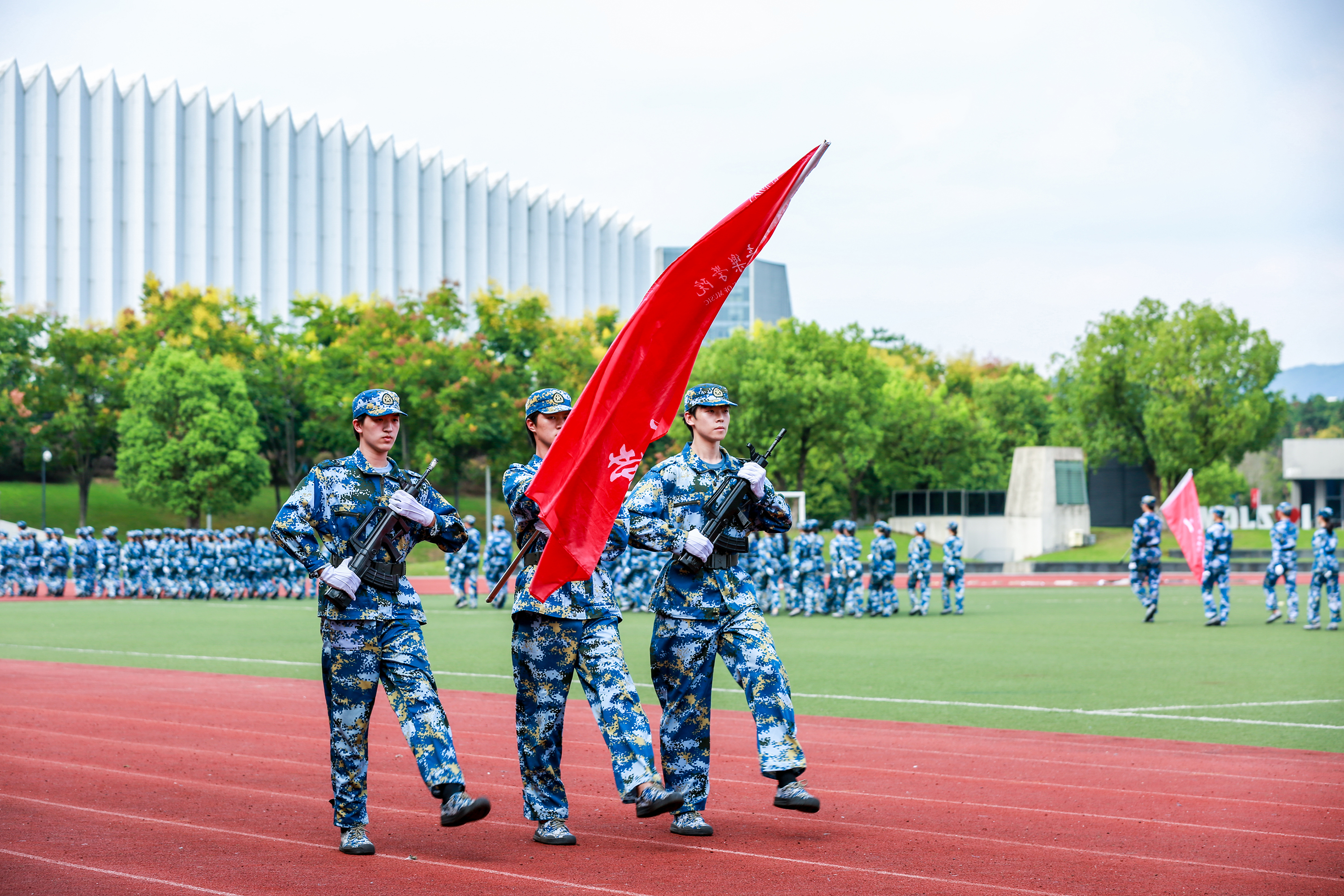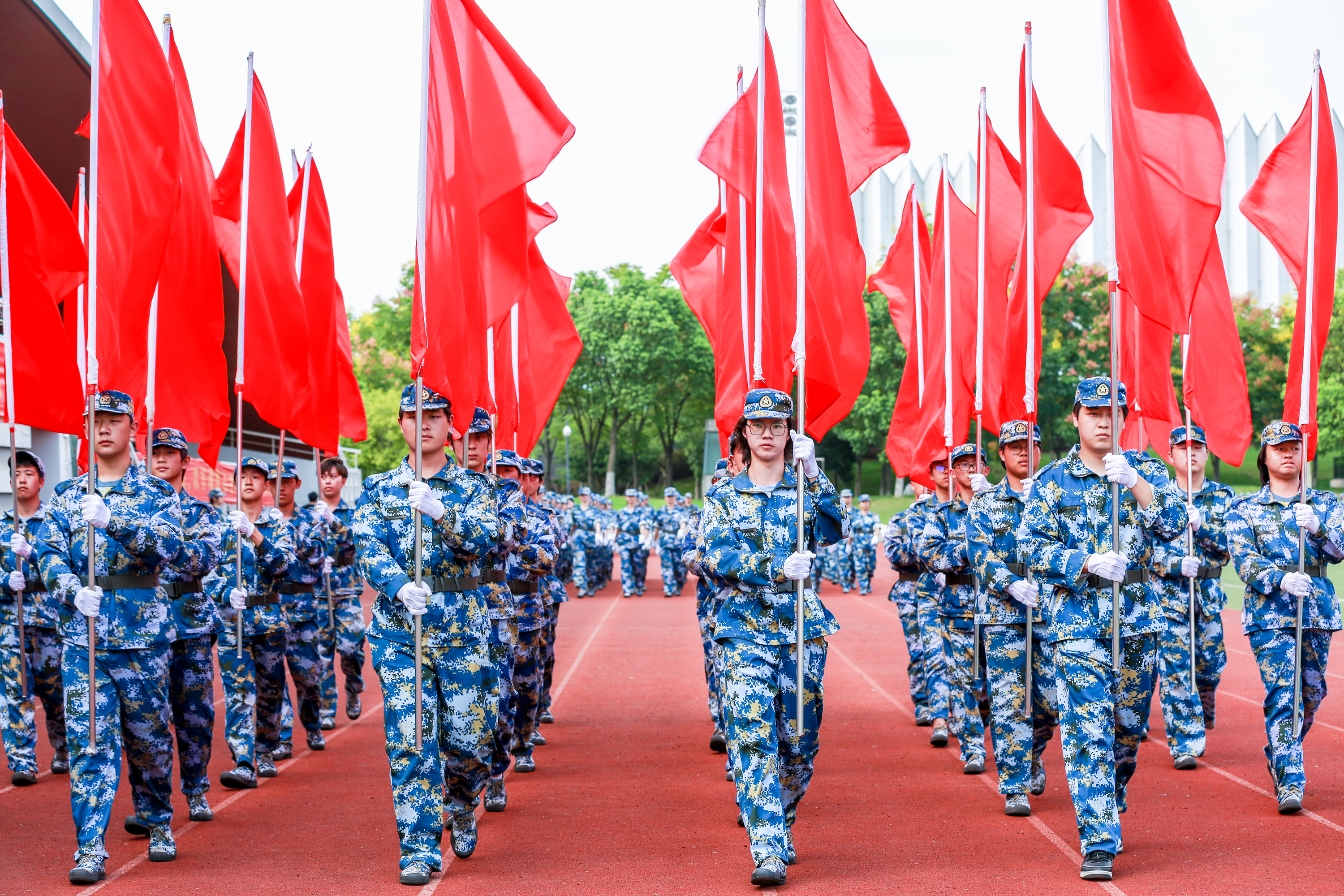 現(xiàn)場(chǎng),由受訓(xùn)學(xué)生組成的紅旗方隊(duì)、軍體拳方陣、班排戰(zhàn)術(shù)表演方陣分別進(jìn)行了匯報(bào)表演。飄揚(yáng)的紅旗、颯爽的英姿、整齊劃一的步伐,鏗鏘有力的口號(hào)燃爆全場(chǎng),充分展現(xiàn)了浙音學(xué)子朝氣蓬勃、奮發(fā)有為精神風(fēng)貌,贏得與會(huì)領(lǐng)導(dǎo)和在場(chǎng)觀眾的陣陣掌聲。