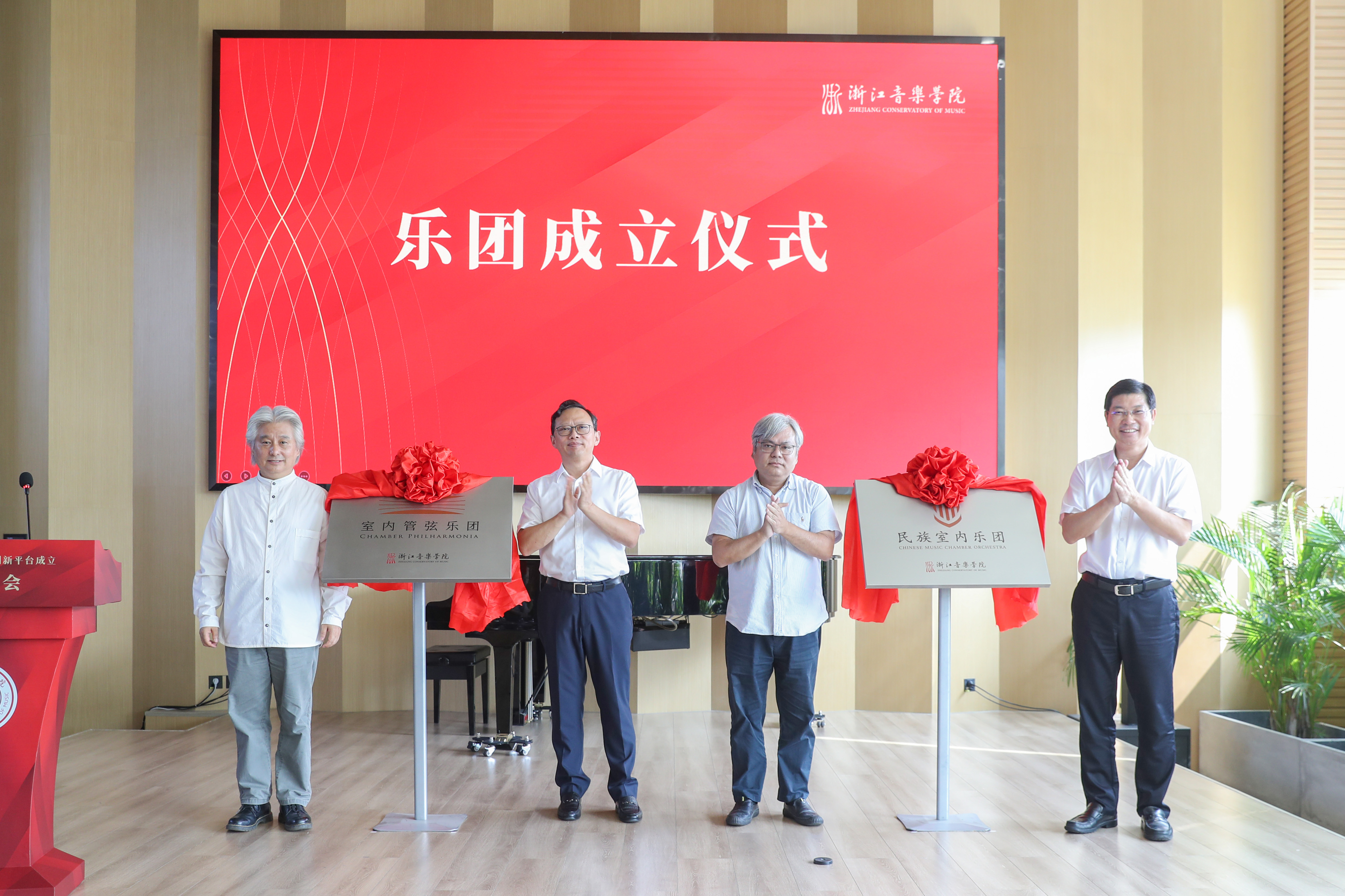柳河、干武東、王瑞、楊九華共同為浙江音樂(lè)學(xué)院民族室內(nèi)樂(lè)團(tuán)、室內(nèi)管弦樂(lè)團(tuán)揭牌