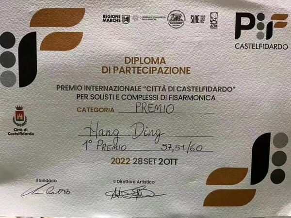 近日,在剛剛落下帷幕的第47屆意大利卡斯特費達多國際手風琴大賽中(簡稱PIF),學院流行音樂系本科三年級學生丁航(指導教師:吳雯怡)力壓群雄,榮獲該賽事最高組別“藝術家組”第一名,并授予NUGO特別獎。