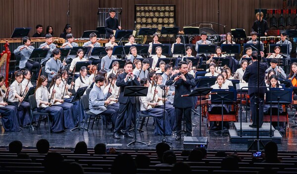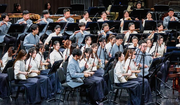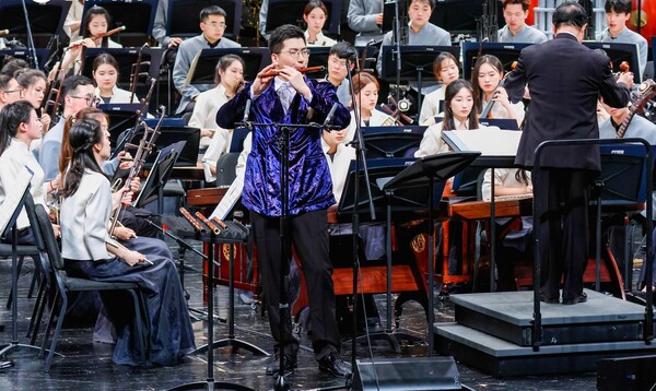本場音樂會囊括了多個民族與地區(qū)的音樂。音樂會以《國風》拉開序幕,曲名取自先秦詩歌集,樂曲化用《梅花三弄》的曲調(diào),唱出了各地民族的風俗習尚,展現(xiàn)了中華民族堅韌自強的精神品格。旋律鋪陳,似走筆行云流水;絲弦撥動,似佩環(huán)鳴動淙琤,俯仰之間便成《蘭亭》華章,文人之高曠深致盡在箏音中。“我們新疆好地方啊,天山南北好牧場”,樂曲起之徐緩平穩(wěn),逐漸歡快,女聲敘嘆新疆美景,歌詞抒發(fā)援疆情懷,以熱烈的舞蹈性將《我們新疆好地方》推向高潮。高亢笛聲奏出山歌性的旋律,特殊調(diào)式營造出奇譎的氣氛,在傳統(tǒng)與現(xiàn)代結(jié)合的音樂語匯下,一曲《飛歌》令聽眾身處西南邊陲,共賞奇麗峭拔的山川景物。悶雷滾動,大地在《風之歌》中蘇醒,悠揚婉轉(zhuǎn)的長調(diào)為觀眾緩緩鋪開一幅草原圖景,曲調(diào)與節(jié)奏隨著器樂模仿出的呼麥與馬蹄聲逐漸粗獷豪放,展現(xiàn)出具有蒙族特色的歡騰景象。竹笛與嗩吶吹奏出膾炙人口的《阿里郎》,兩首民歌的串燒銜接自然連貫,柔和悠長的旋律與歡悅的三拍子,仿佛在模仿朝鮮族人民的舞蹈,瀟灑而典雅。肅穆恬遠的旋律與鼓點將聽眾領入高山雪域,在四把中胡的領奏下,樂隊由慢到快,《弦子舞》展現(xiàn)出的舞蹈形象,時而端莊穩(wěn)重時而瀟灑飄逸,藏族人民載歌載舞的場景已在眼前。九州民族共一心,樂音贊頌團結(jié)情,走過中華大地的東西南北中,最后以《龍躍東方》作為收尾,八音克諧,配器多彩,鼓樂的雄渾激越,管弦的抒情雍容,在民歌素材《茉莉花》的串聯(lián)融合下,顯示出進取而不失溫潤的民族性格。