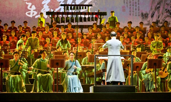 《宋韻·華章》立足傳統(tǒng)、守正創(chuàng)新,深入挖掘了宋畫、宋詞、宋樂、宋學(xué)等最具代表性的宋代文化元素,以音樂之“韻”為媒,將這些內(nèi)容加以重組、串聯(lián),進而對“宋韻”進行深度解讀和全新詮釋。作品以“民族管弦樂+合唱”為主要形式,由序曲,展現(xiàn)宋畫之美的《雅韻》、展現(xiàn)宋詞之美的《神韻》、展現(xiàn)宋樂之美的《風(fēng)韻》、展現(xiàn)宋學(xué)之美的《意韻》,尾聲組成。其中,序曲《宋韻——我欲乘風(fēng)歸去》通過“民族管弦樂+合唱”的形式,以音樂的語匯勾勒出宋韻之美,揭開整場音樂會的序幕;《雅韻》以宋代李公麟創(chuàng)作的水墨紙本畫《西園雅集圖》為意境,以民族管弦樂為主要形式,展示了以文會友的中國文人傳統(tǒng);《神韻》選擇膾炙人口、家喻戶曉的經(jīng)典宋詞,在民族交響的結(jié)構(gòu)中采用吟、誦、唱、和等形式,展示了中華文學(xué)的絕美意境;《風(fēng)韻》采用“古琴+小樂隊”形式,將宋代著名音樂家、“白石道人”姜夔留下的詞調(diào)音樂的旋律進行重新編配、發(fā)展、創(chuàng)編,探索了宋樂與時代審美相結(jié)合的全新表達;《意韻》則以朱熹理學(xué)和沈括的《夢溪筆談》為藍本,用民族交響的寫實與浪漫,表達了中華民族“佛儒道”三位一體和“天地人”和諧共生的哲學(xué)思想和價值理念,形成中華文化大美之勝境。尾聲《華章——勝卻人間無數(shù)》作為整部作品的高潮,以民樂大交響的形式禮贊新時代,奏響中華民族偉大復(fù)興的燦爛未來,體現(xiàn)新一代中華兒女薪火相傳、砥礪前行的新時代奮進足跡。