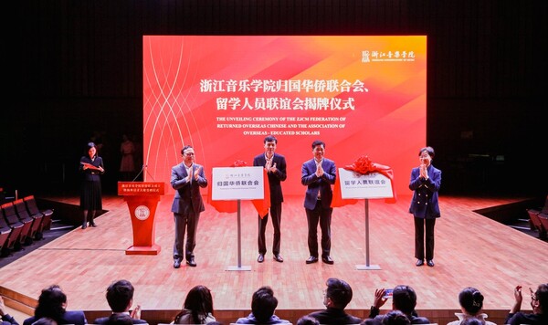 朱海閔、干武東、王瑞、柴聞樂共同為浙江音樂學(xué)院歸國華僑聯(lián)合會、留學(xué)人員聯(lián)誼會揭牌。