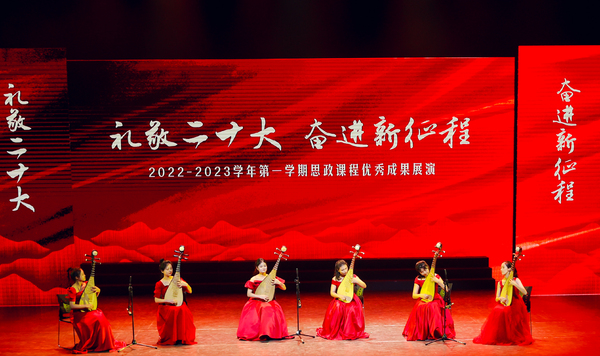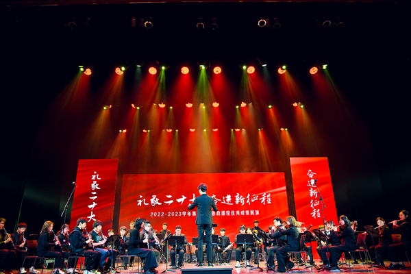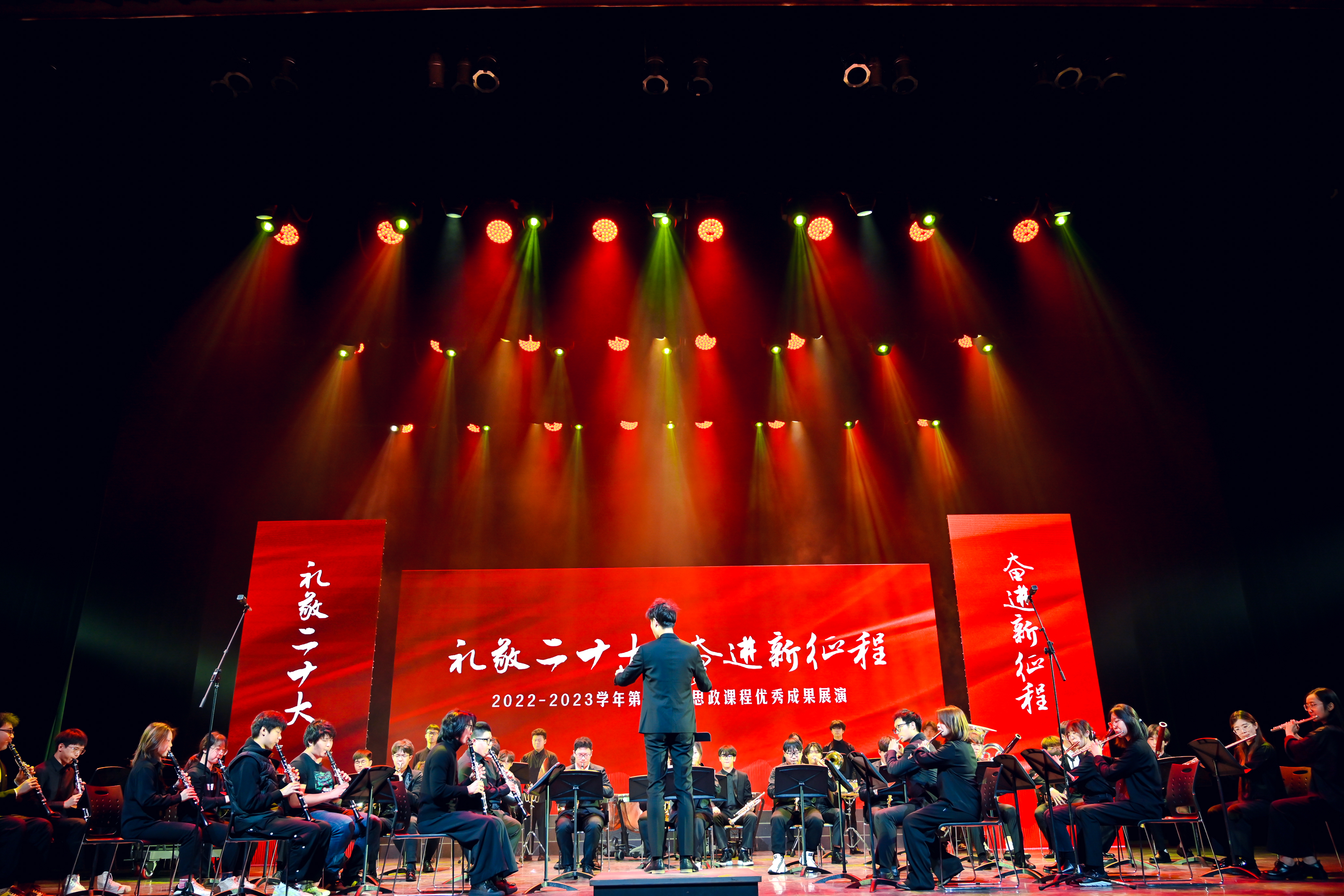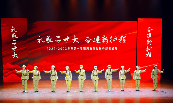 此次展演是學(xué)院舉辦的第九場思政課程優(yōu)秀成果展演。近年來,學(xué)院全面貫徹落實習(xí)近平總書記在學(xué)校思想政治理論課教師座談會上的講話精神,深入貫徹落實《關(guān)于加強馬克思主義學(xué)院建設(shè)的實施方案》,注重思政課教學(xué)創(chuàng)新改革,探索出一條“思政+音樂”的特色教學(xué)之路。馬克思主義學(xué)院在思政課上列出“菜單式”清單,引導(dǎo)學(xué)生立足課堂教學(xué)、依托課程教材、依靠專業(yè)特點,用藝術(shù)形式演繹和再現(xiàn)思政課程教學(xué)內(nèi)容;各院系的專任教師擔(dān)綱藝術(shù)指導(dǎo),從專業(yè)角度確保節(jié)目的高品質(zhì)和表現(xiàn)力;參演學(xué)生珍惜上臺演出的難得機會,在課業(yè)之余認真編排節(jié)目并反復(fù)排練,深入把握節(jié)目思想內(nèi)涵和角色演繹。三者的傾情投入,使思政課程優(yōu)秀成果展演的思想性、教育性和藝術(shù)性得到充分彰顯,讓所有的參與者和觀眾沉浸式地接受心靈的洗禮,進一步強化了對黨的熱愛并煥發(fā)出奮進新時代新征程的動力和激情。作為實踐教學(xué)的延伸和深化,思政課程優(yōu)秀成果展演正在成為檢驗檢閱學(xué)院大思政工作的有效方式和落實三全育人的靚麗風(fēng)景。