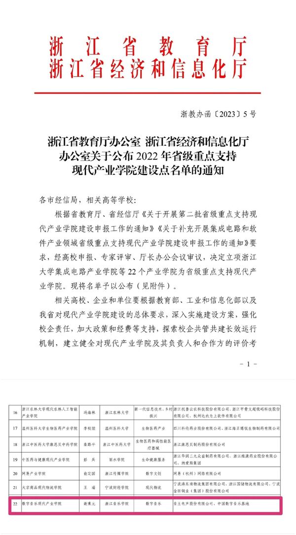 近日,浙江省教育廳辦公室、浙江省經(jīng)濟(jì)和信息化廳辦公室聯(lián)合發(fā)布了《關(guān)于公布2022年省級(jí)重點(diǎn)支持現(xiàn)代產(chǎn)業(yè)學(xué)院建設(shè)點(diǎn)名單的通知》,學(xué)院與音王電聲股份有限公司、中國(guó)數(shù)字音樂(lè)基地共建的浙江音樂(lè)學(xué)院數(shù)字音樂(lè)現(xiàn)代產(chǎn)業(yè)學(xué)院獲批立項(xiàng)省級(jí)重點(diǎn)支持現(xiàn)代產(chǎn)業(yè)學(xué)院建設(shè)點(diǎn),也是學(xué)院首次獲批該建設(shè)點(diǎn)。