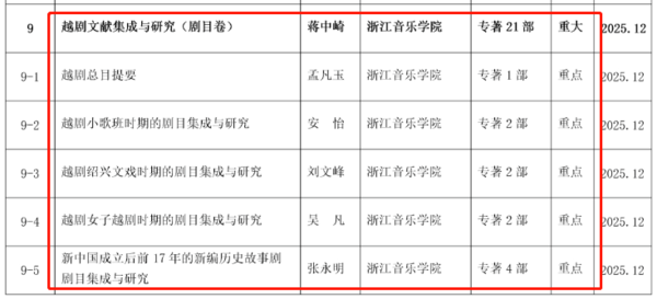 本項(xiàng)目是國(guó)內(nèi)首次全面完整匯集出版中國(guó)越劇百年演出劇目的重要工程。項(xiàng)目聚焦越劇百年(1906—2006)發(fā)展歷程中的具有較大社會(huì)影響或藝術(shù)影響的劇目文本,依據(jù)越劇發(fā)展的歷史脈絡(luò),從劇目“劇本來(lái)源”“劇本梗概”“主創(chuàng)團(tuán)隊(duì)”“首演信息”“藝術(shù)特色”和“藝術(shù)影響”6個(gè)方面,對(duì)劇目文本、舞臺(tái)呈現(xiàn)和藝術(shù)傳播等進(jìn)行全面梳理。自2020年12月獲浙江音樂(lè)學(xué)院重點(diǎn)科研項(xiàng)目立項(xiàng)以來(lái),課題組以演出版本的社會(huì)歷史影響為主線,從3000多部越劇劇目中,精心篩選并收集劇本200多部,作為本項(xiàng)目收錄和研究的重點(diǎn)。去年底,學(xué)院與浙江人民出版社簽署《中國(guó)越劇文獻(xiàn)集成和研究》出版項(xiàng)目戰(zhàn)略合作框架協(xié)議,并將此項(xiàng)目申報(bào)國(guó)家“十四五”重大圖書出版工程和2023年度國(guó)家圖書出版基金。課題組計(jì)劃于2025年出版完成《中國(guó)越劇文獻(xiàn)集成和研究》共20冊(cè)。