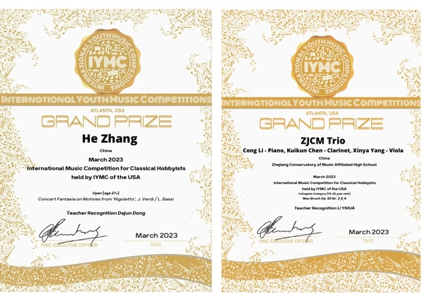 近日,美國(guó)IYMC國(guó)際青年音樂(lè)大賽落下帷幕,管弦系研究生張赫憑借《弄臣》主題幻想曲,以總分100的成績(jī)榮獲國(guó)際音樂(lè)比賽大獎(jiǎng)(27歲以上組別),指導(dǎo)老師董德君教授榮獲最佳教師獎(jiǎng)。管弦系學(xué)生李聰、陳奎坤、楊欣雅組成的三重奏組合榮獲國(guó)際音樂(lè)比賽大獎(jiǎng)(學(xué)院組19-26歲),指導(dǎo)老師李藝花副教授。