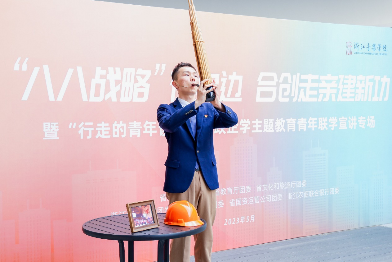 伴隨著裊裊的吹竽聲,在學(xué)院青年藝術(shù)家宣講團(tuán)成員、省思政微課特等獎獲得者王劉的宣講中,展示了校園建設(shè)中的一頂安全帽,全球巡演中的一張照片和《宋韻華章》中的一把古聲竽,他分享了自己眼中的文化浙江發(fā)展歷程。省教育廳8090宣講團(tuán)成員毛寒冰帶來的“八八戰(zhàn)略在身邊”主題宣講,用一項(xiàng)項(xiàng)教育工程展現(xiàn)“八八戰(zhàn)略”下浙江教育快速發(fā)展的二十年圖景。“我們對家庭困難的學(xué)生實(shí)行全免費(fèi)午餐。”“對農(nóng)村中小學(xué)教師實(shí)施素質(zhì)提升工程,3年內(nèi)完成17萬名農(nóng)村中小學(xué)教師培訓(xùn)。”……毛寒冰話音剛落,會場上響起了一片贊同聲。“浙企青音”浙江國企青年理論宣講團(tuán)成員、省國有資本運(yùn)營有限公司所屬發(fā)展資產(chǎn)公司胡競將“八八戰(zhàn)略”指引下的國企故事連成線,搬上宣講臺,深情講述了浙江國企在奮進(jìn)“兩個先行”的賽道上唯實(shí)惟先,善做善成的生動實(shí)踐。
