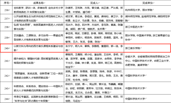 7月24日,教育部發(fā)布了關于批準2022年國家級教學成果獎獲獎項目的決定。由音樂學系朱寧寧教授領銜完成的“以新文科為導向的西方音樂課程體系建設與創(chuàng)新”教學成果項目榮獲高等教育(本科)國家級教學成果獎二等獎,實現(xiàn)了學校在國家級教學成果獎方面零的突破,也是學院在國家級重大獎項方面的歷史性突破。