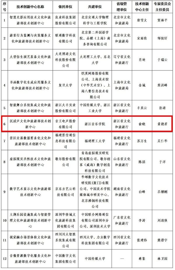 近日,文化和旅游部印發(fā)《文化和旅游部關(guān)于公布首批文化和旅游部技術(shù)創(chuàng)新中心建設(shè)名單的通知》,啟動12個首批文化和旅游部技術(shù)創(chuàng)新中心建設(shè)的工作,以音王電聲股份有限公司為依托單位、以浙江音樂學(xué)院為主要共建單位的“沉浸聲文化和旅游部技術(shù)創(chuàng)新中心”位列其中。