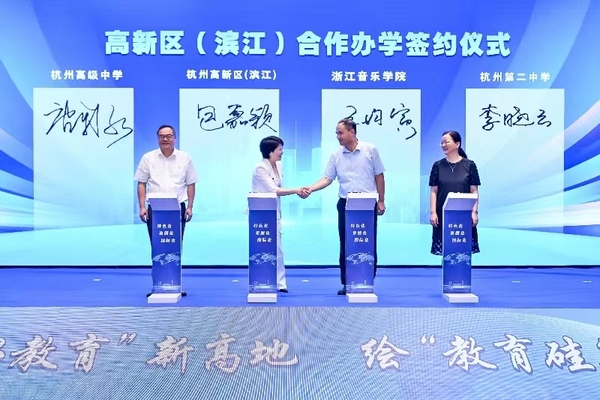 9月7日上午,在杭州濱江區(qū)教育大會上,浙江音樂學(xué)院與濱江區(qū)政府及杭州高級中學(xué)共同簽署合作辦學(xué)協(xié)議,將共同打造一所以音樂藝術(shù)為特色的基礎(chǔ)教育學(xué)校,全面提升藝術(shù)教育水平和學(xué)生音樂素養(yǎng)。濱江區(qū)委、區(qū)政府、區(qū)人大、區(qū)政協(xié)四套班子主要領(lǐng)導(dǎo)及學(xué)院黨委副書記王均寅等出席儀式。