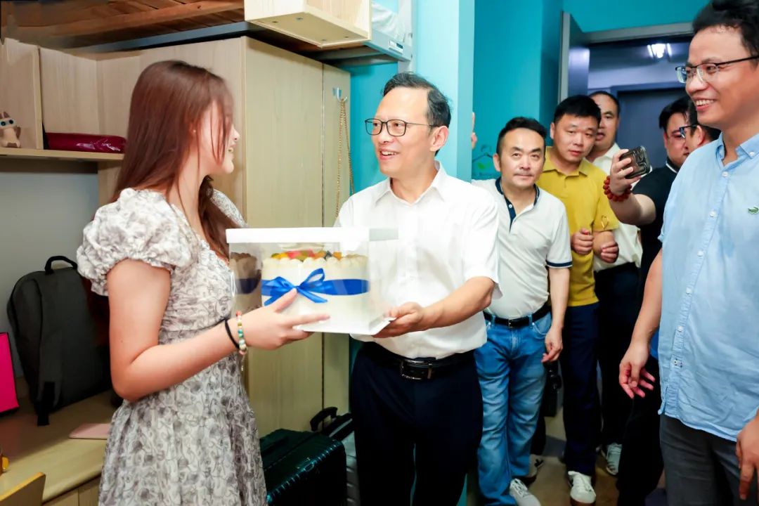 當(dāng)天,學(xué)院領(lǐng)導(dǎo)王瑞、王均寅、蔡亦軍、汪洋、奚麗萍、董德君一行來到報(bào)到點(diǎn)、公寓看望新生,與同學(xué)、家長(zhǎng)們親切交談,并為過生日的同學(xué)送上蛋糕和賀卡。