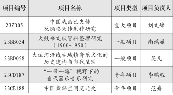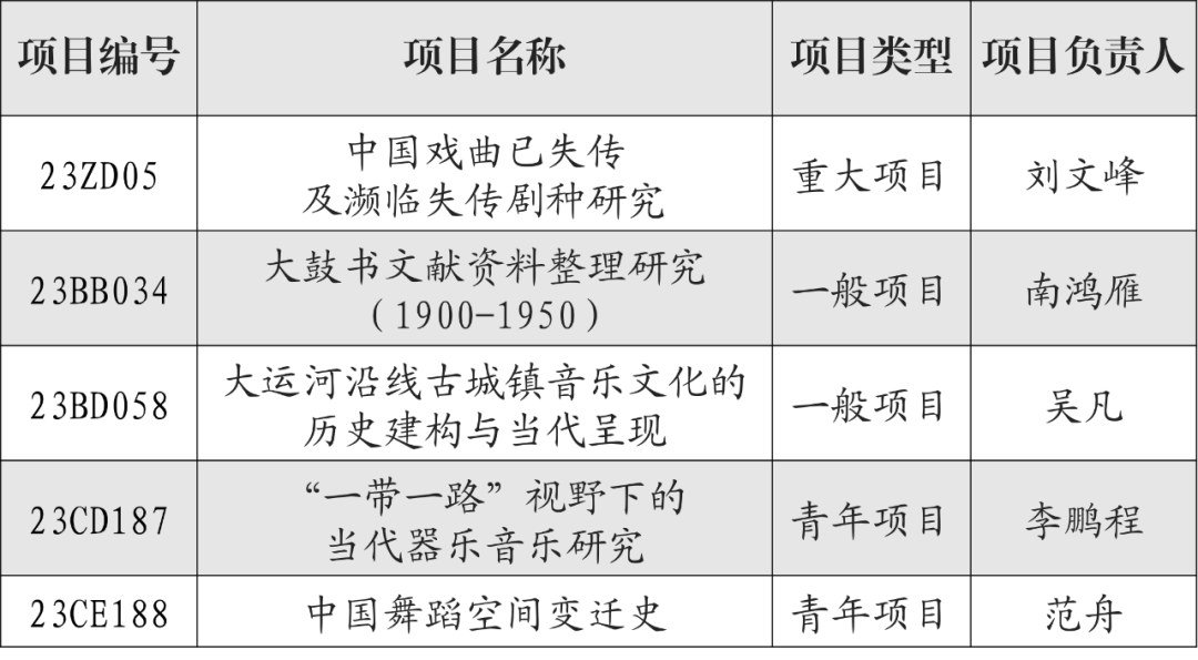 近日,全國藝術(shù)科學(xué)規(guī)劃領(lǐng)導(dǎo)小組辦公室公布了2023年度國家社科基金藝術(shù)學(xué)項目立項名單,我校4個項目獲批2023年度國家社科基金藝術(shù)學(xué)項目。其中,《中國戲曲已失傳及瀕臨失傳劇種研究 》(項目負(fù)責(zé)人:劉文峰 ) 獲批重大項目,《大鼓書文獻資料整理研究(1900-1950) 》(項目負(fù)責(zé)人:南鴻雁) 、《大運河沿線古城鎮(zhèn)音樂文化的歷史建構(gòu)與當(dāng)代呈現(xiàn)》(項目負(fù)責(zé)人:吳凡)獲批一般項目 、《“一帶一路”視野下的當(dāng)代器樂音樂研究》(項目負(fù)責(zé)人:李鵬程) 、《中國舞蹈空間變遷史 》(項目負(fù)責(zé)人:范舟) 獲批青年項目。