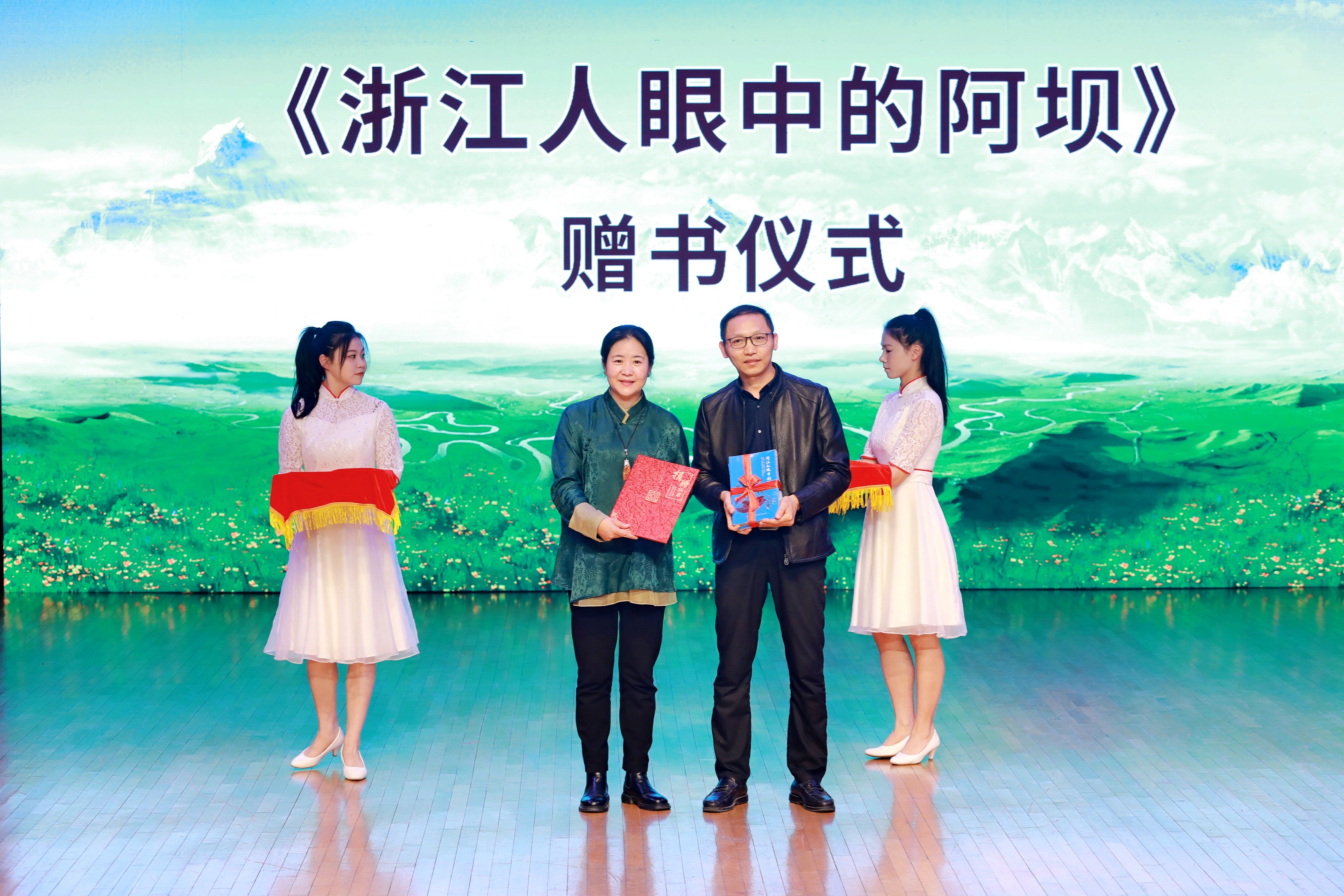 此次“非遺走親—川西行走之聲·川西藏族山歌暨‘浙阿對口支援’文化共富感恩回訪主題音樂會”活動,旨在通過交流座談會以及音樂會的形式,以川西藏族山歌為主題的非遺項目展現(xiàn)在大眾面前,助力阿壩州非遺傳承保護(hù)與發(fā)展出圈。舞臺上,來自四川阿壩州的本土音樂人用獨(dú)特的韻味演繹了《黑帳篷》《博巴森根》《羌族山歌》《川西藏族山歌》等形式多樣的藏族山歌,將“原生態(tài)”注入靈魂,用最純正、樸素的聲音,結(jié)合藏族彈唱、羌笛演奏、羌族服飾秀等節(jié)目表演,呈現(xiàn)出一場沉浸式視聽盛宴,讓人不禁感嘆川西藏羌文化的豐富多彩。浙音學(xué)子與阿壩州民族音樂人同臺表演,用木管五重奏演繹了一曲《唱支山歌給黨聽》以及獨(dú)唱原創(chuàng)歌曲《燭火》,最后與所有演職人員高亢唱響《再唱山歌給黨聽》,共同開啟了一場傳統(tǒng)民族文化與現(xiàn)代音樂交融的藝術(shù)盛會,共同唱出了浙阿人民不忘初心、永遠(yuǎn)感恩黨、聽黨話、跟黨走,永遠(yuǎn)把心中的歌兒唱給黨的肺腑心聲?;顒蝇F(xiàn)場,還舉行了《浙江人眼中的阿壩》新書捐贈儀式,促進(jìn)了兩地文化的交流交往交融,豐富了全域旅游系列新書內(nèi)容?!墩憬搜壑械陌巍肥菑恼憬说囊暯浅霭l(fā),用文字還原、用圖片記錄下他們對阿壩人文風(fēng)情、自然風(fēng)光、社會風(fēng)貌的見聞,展現(xiàn)出浙阿人民的深厚友情。