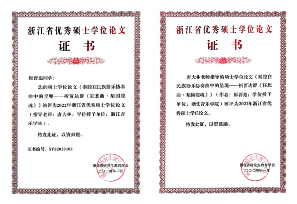 近日,浙江省研究生教育學(xué)會(huì)發(fā)布了《關(guān)于表彰2022年浙江省優(yōu)秀博士學(xué)位論文和優(yōu)秀碩士學(xué)位論文的決定》(浙研教字第〔2024〕01號)通知,公布了2022年浙江省優(yōu)秀博士、碩士學(xué)位論文評選結(jié)果,共評選出優(yōu)秀博士學(xué)位論文63篇、優(yōu)秀博士學(xué)位論文提名論文64篇,優(yōu)秀碩士學(xué)位論文104篇。學(xué)院作曲與指揮系2022屆研究生原晉彪的學(xué)位論文《秦腔在民族器樂協(xié)奏曲中的呈現(xiàn)——析賈達(dá)群<狂想曲·梨園腔魂>》(指導(dǎo)教師:唐大林副教授)成功入選。