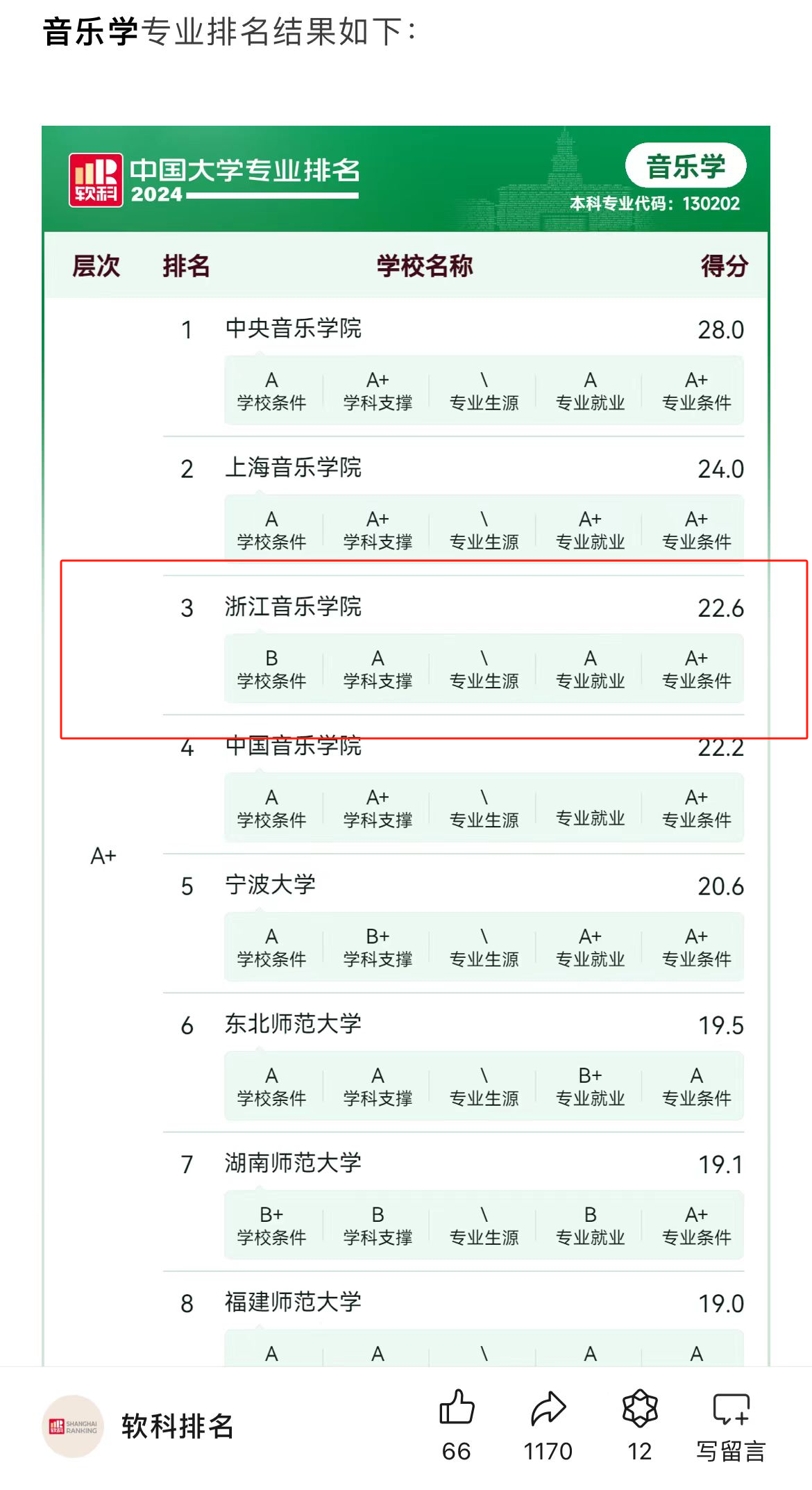 近日,高等教育評價機(jī)構(gòu)軟科發(fā)布“2024軟科中國大學(xué)專業(yè)排名”。結(jié)果顯示,我校音樂學(xué)專業(yè)排名全國第3位,列入全國頂尖專業(yè)(A+)。同時,作曲與作曲技術(shù)理論、舞蹈學(xué)、音樂表演、表演、舞蹈表演5個專業(yè)位居全國優(yōu)質(zhì)專業(yè)(A),分別排名4、5、7、9、9位。