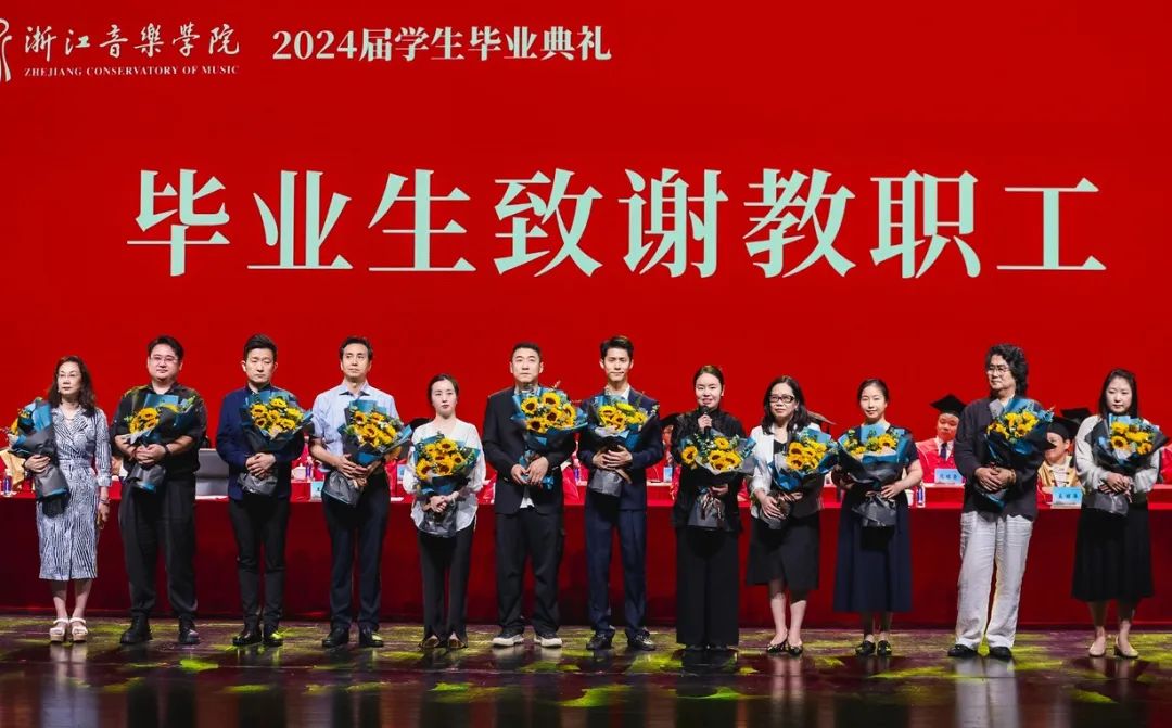 各院系教師代表,以及后勤、樂典等部門職工代表接受畢業(yè)生代表獻(xiàn)花,并為畢業(yè)生送上祝福。