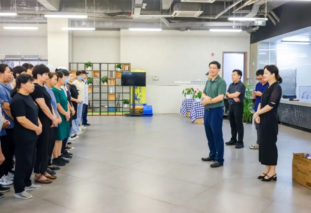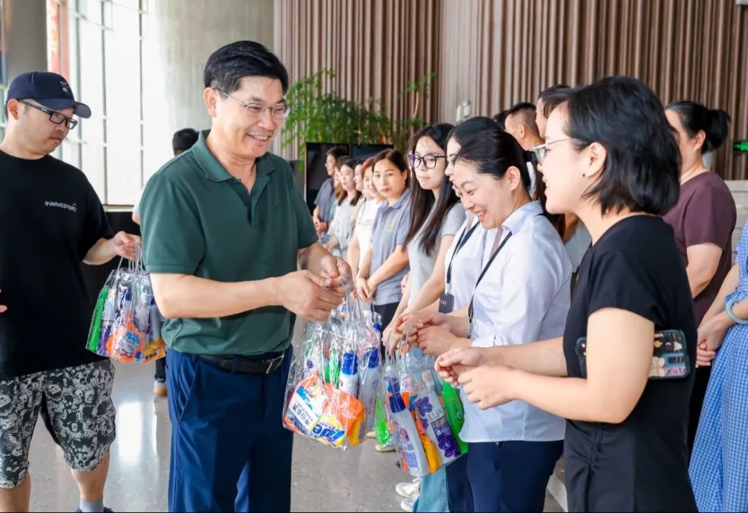 校領(lǐng)導(dǎo)首先看望了后勤與校園安全處、繼續(xù)教育學(xué)院、樂(lè)典公司的員工們,并對(duì)他們?cè)诟邷叵聢?jiān)守崗位、辛勤工作給予了表?yè)P(yáng)肯定和誠(chéng)摯感謝。他們?yōu)閱T工們送上慰問(wèn)品,并不忘叮囑大家要合理安排工作時(shí)間和勞動(dòng)強(qiáng)度,在做好工作的同時(shí)注意防暑降溫,勞逸結(jié)合,確保身體健康。