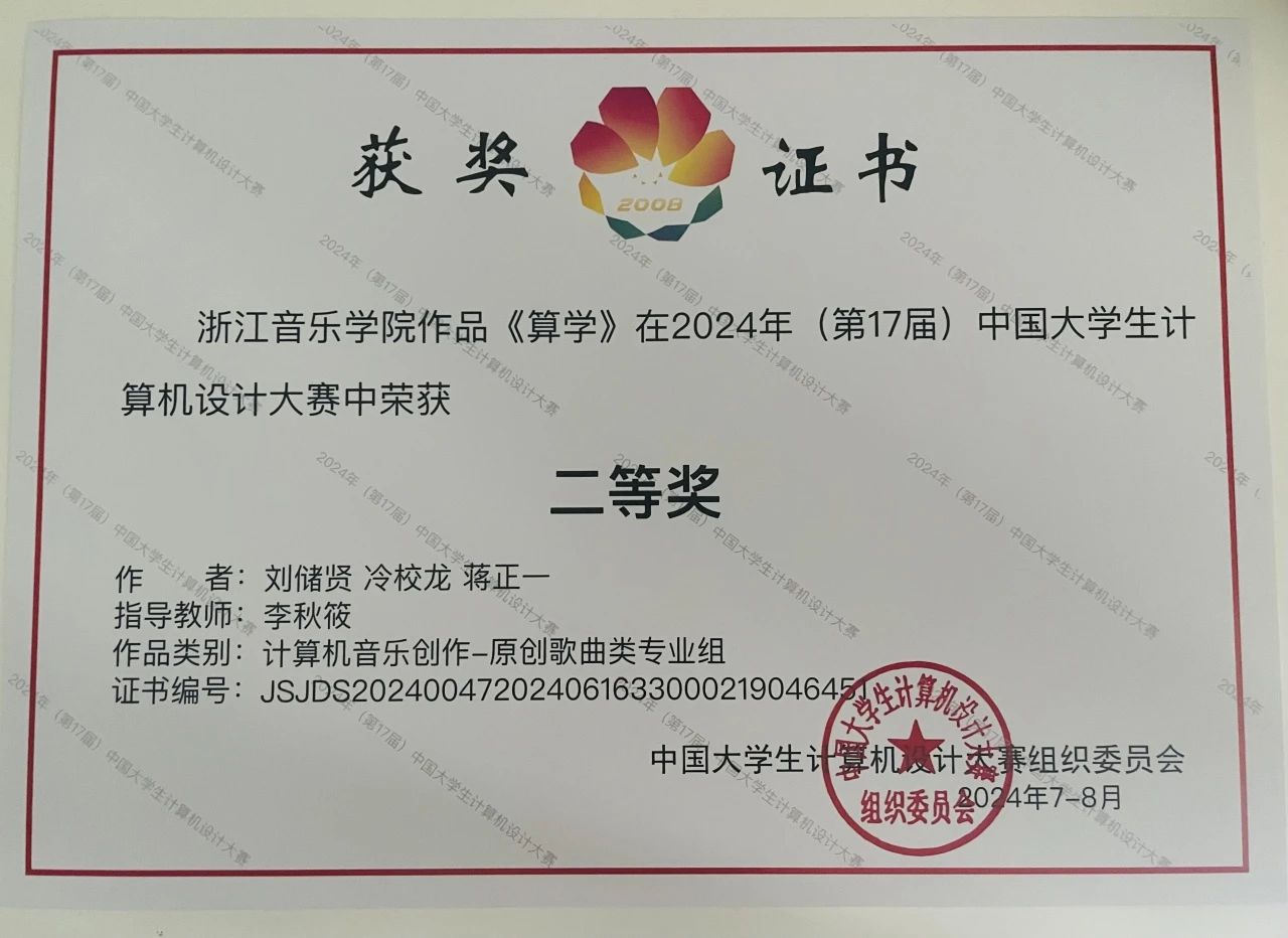 近日,2024年(第17屆)中國大學(xué)生計(jì)算機(jī)設(shè)計(jì)大賽“信息可視化設(shè)計(jì)/計(jì)算機(jī)音樂創(chuàng)作”賽道決賽圓滿落幕。經(jīng)過激烈角逐,學(xué)校學(xué)生憑借扎實(shí)的專業(yè)知識、創(chuàng)新的思維能力和精湛的實(shí)踐技能,在全國眾多優(yōu)秀作品中脫穎而出。其中,2021級藝術(shù)與科技學(xué)生喬漢英交互音樂作品《相生》榮獲一等獎(指導(dǎo)老師:李秋筱、王新宇),2022級音樂設(shè)計(jì)與制作學(xué)生劉儲賢、蔣正一原創(chuàng)歌曲作品《算學(xué)》榮獲二等獎(指導(dǎo)老師:李秋筱),2020級音樂設(shè)計(jì)與制作專業(yè)學(xué)生畢逸飛原創(chuàng)音樂作品《經(jīng)綸韻》榮獲三等獎(指導(dǎo)老師:姜超遷)。