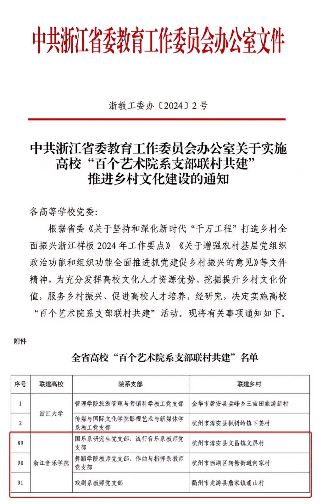 全省高校“百個(gè)藝術(shù)院系支部聯(lián)村共建”活動(dòng)是推動(dòng)鄉(xiāng)村振興、助力共同富裕的有效路徑,也是抓好高校黨建“四個(gè)融合”工作的重要一環(huán)。近年來,我校堅(jiān)持黨建統(tǒng)領(lǐng)作用,充分發(fā)揮學(xué)科專業(yè)、人才和藝術(shù)資源優(yōu)勢(shì),已與轉(zhuǎn)塘街道的11個(gè)村社、淳安文屏村、龍游浦山村等20余個(gè)基層黨組織建立長期黨建聯(lián)建關(guān)系,其中國樂系研究生黨支部、流行音樂系教師黨支部、舞蹈學(xué)院教師黨支部、作曲與指揮系教師黨支部、戲劇系教師黨支部等5個(gè)黨支部,與淳安縣文屏村、西湖區(qū)何家村、龍游縣浦山村等3個(gè)村的聯(lián)村共建項(xiàng)目入選全省高校“百個(gè)藝術(shù)院系支部聯(lián)村共建”名單,通過組織聯(lián)建、活動(dòng)聯(lián)辦、文化聯(lián)創(chuàng)、人才共育等,精心搭建多元載體,在服務(wù)鄉(xiāng)村振興、促進(jìn)人才培養(yǎng)方面取得了階段性成果。
