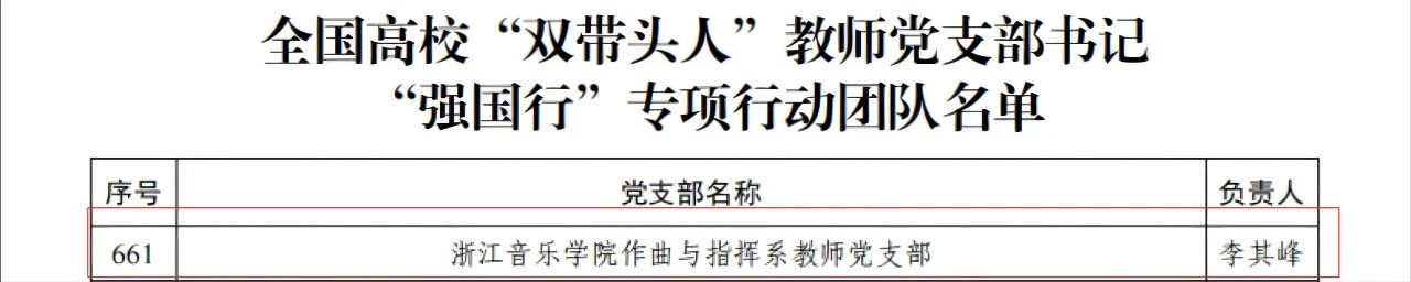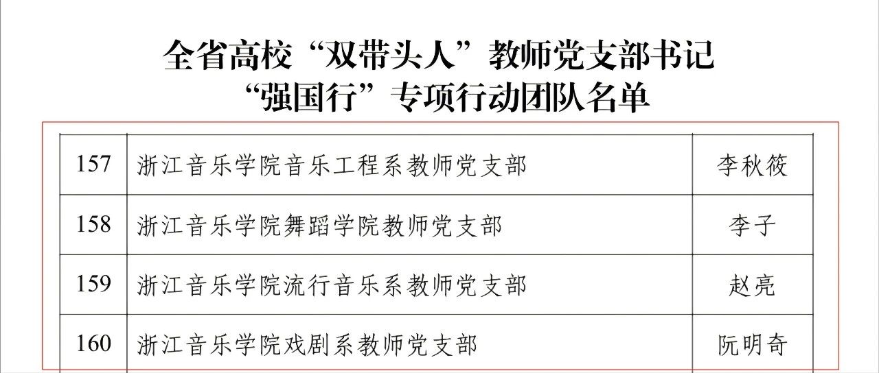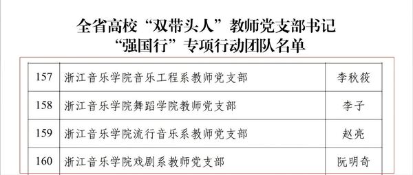 近日,教育部辦公廳、浙江省委教育工委先后公布了全國(guó)高校和全省高校“雙帶頭人”教師黨支部書記“強(qiáng)國(guó)行”專項(xiàng)行動(dòng)團(tuán)隊(duì)名單,我校作曲與指揮系教師黨支部和流行音樂系教師黨支部、舞蹈學(xué)院教師黨支部、戲劇系教師黨支部、音樂工程系教師黨支部分別成功入選。