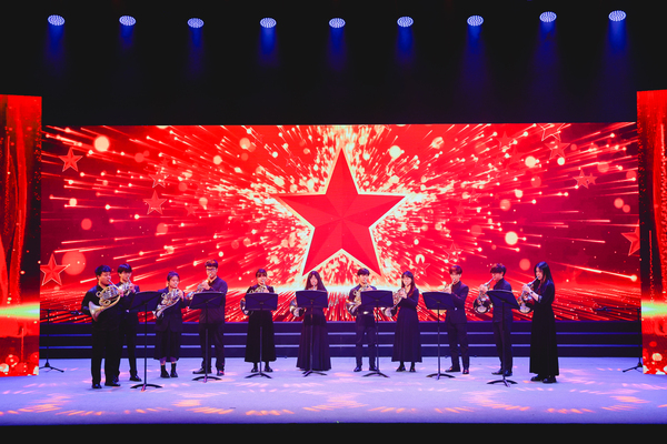 隨著悠揚(yáng)的音樂(lè)響起,舞蹈《花兒為什么這樣紅》拉開(kāi)了展演的序幕,舞者用優(yōu)美的舞姿,述說(shuō)著冰山之上的動(dòng)人故事。圓號(hào)重奏《紅星閃閃》《中國(guó)軍魂》以雄壯激昂的旋律,展現(xiàn)了中國(guó)軍人英勇無(wú)畏、勇往直前的精神風(fēng)貌,激勵(lì)著新時(shí)代的中國(guó)人在風(fēng)雨中砥礪前行。節(jié)目《繡紅旗》節(jié)選自歌劇《江姐》,通過(guò)演繹江姐和她的獄中同志們共同繡制紅旗的場(chǎng)景,展現(xiàn)出革命先烈們對(duì)新中國(guó)的無(wú)限熱愛(ài)與對(duì)革命事業(yè)的堅(jiān)定信念。情景朗誦《永不消逝的聲音》以延安新華廣播電臺(tái)為脈絡(luò),串連起抗日戰(zhàn)爭(zhēng)時(shí)期以來(lái)激動(dòng)人心的瞬間。每一段廣播、每一聲呼喚,背后都凝聚著先烈們的聲音,他們的精神永不消逝。男女聲重唱《選擇》用動(dòng)人的歌聲唱出了中國(guó)人民在危難時(shí)刻的頑強(qiáng)與斗志,表達(dá)了對(duì)祖國(guó)的無(wú)限熱愛(ài)和對(duì)未來(lái)的美好憧憬。巨輪破浪、復(fù)興夢(mèng)想,每一句歌詞都彰顯著民族的自信與擔(dān)當(dāng)。