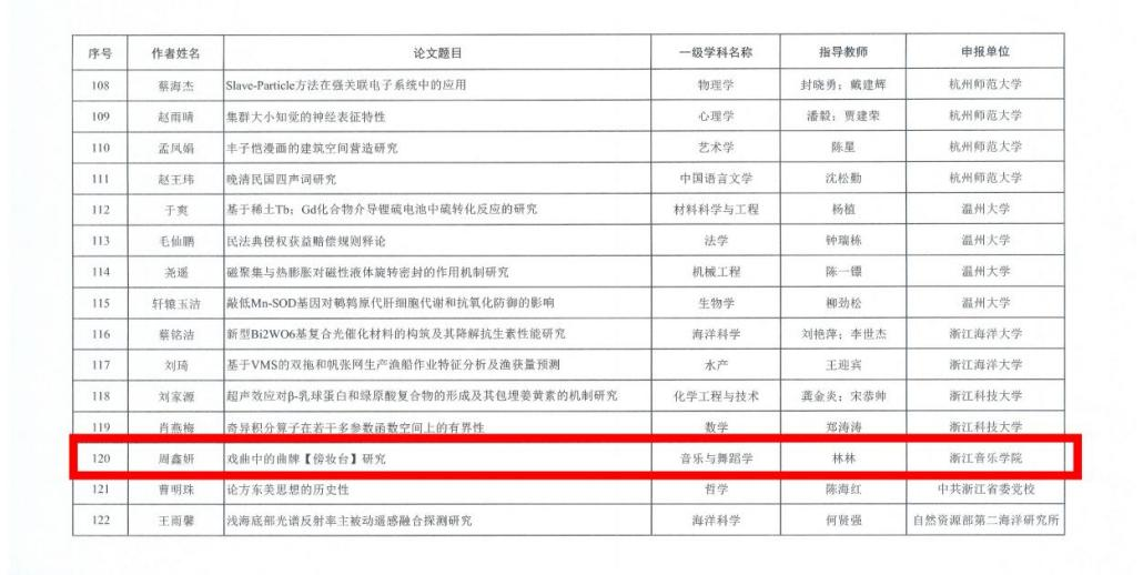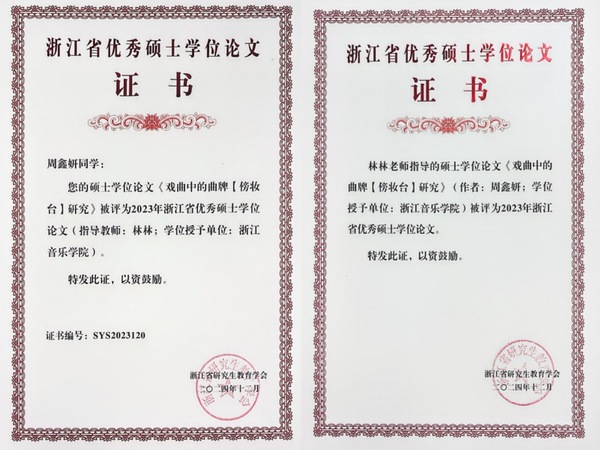 近日,浙江省研究生教育學(xué)會(huì)發(fā)布《關(guān)于表彰2023年浙江省優(yōu)秀博士學(xué)位論文和優(yōu)秀碩士學(xué)位論文的決定》(浙研教字第〔2024〕12號(hào))通知,公布2023年浙江省優(yōu)秀博士、碩士學(xué)位論文評(píng)選結(jié)果,學(xué)院2023屆研究生、音樂學(xué)系周鑫妍的碩士學(xué)位論文《戲曲中的曲牌【傍妝臺(tái)】研究》(指導(dǎo)教師:林林教授)獲得表彰。