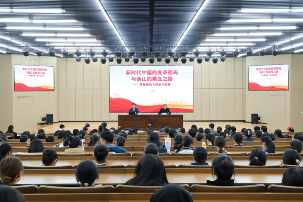 宣講會上,干武東以鮮活的事例、詳實的數(shù)據(jù)、生動的語言,從新時代偉大成就與變革、“八八戰(zhàn)略”指引下的浙江精彩蝶變以及浙音附中學(xué)子責任擔當三個方面進行了系統(tǒng)闡述和深刻講解。他從經(jīng)濟建設(shè)、社會發(fā)展、科技創(chuàng)新、文化復(fù)興等四個方面入手,生動講述了中國從"追趕者"到"領(lǐng)跑者"的歷史性跨越、從“追求溫飽”到“幸福和諧”的質(zhì)的飛躍、從“跟跑”到“并跑”的轉(zhuǎn)變以及從“傳承者”到“傳播者”的發(fā)展。他還深入解讀了“八八戰(zhàn)略”指引下浙江的精彩蝶變,并為附中學(xué)生講述了浙音建校以來的突出成績及附中“文藝輕騎兵”實踐活動的成果,讓在場學(xué)生倍感自豪。