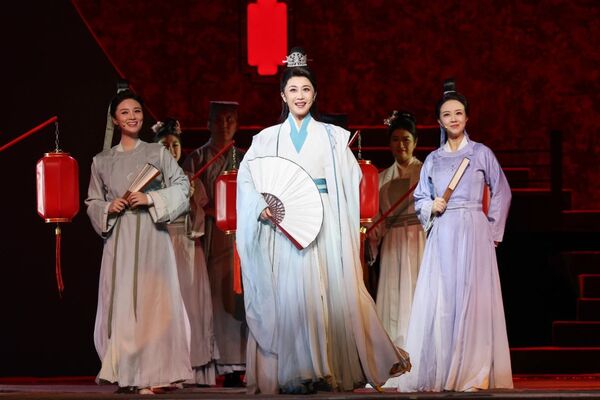 傍晚時分,伴隨著青年指揮家崔媛媛的節(jié)奏,優(yōu)美的旋律將人們的視線拉回到千年宋朝——只見李清照深情地?fù)嶂徘伲瑒≈腥粟w明誠、李格非、青梅、海棠、項羽、賣花郎眾人相繼慢慢向她靠近……李清照于夢中會見故人的場景呈現(xiàn)在眼前。