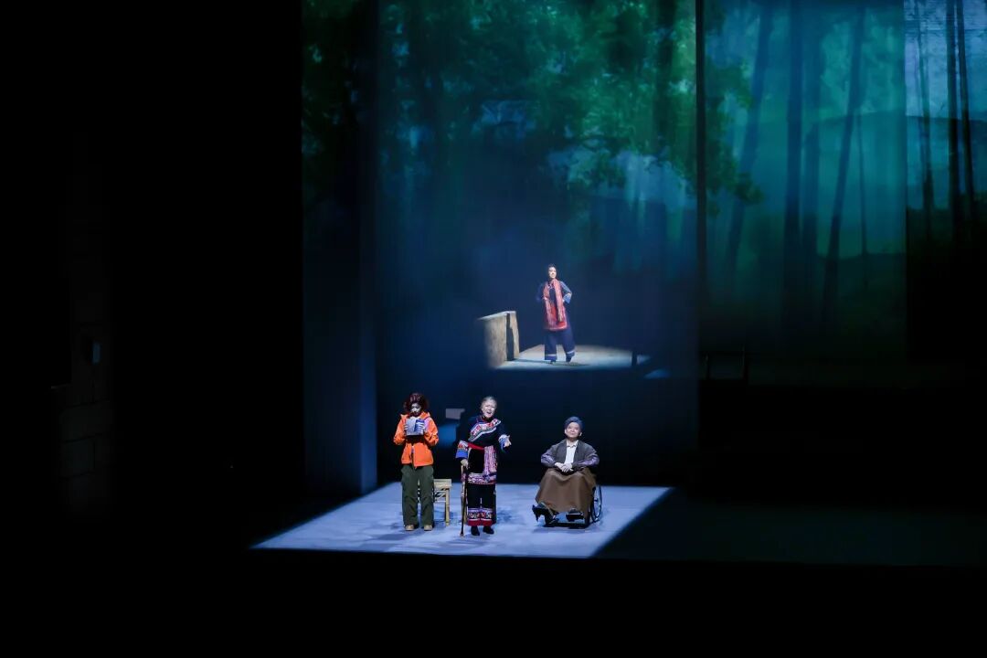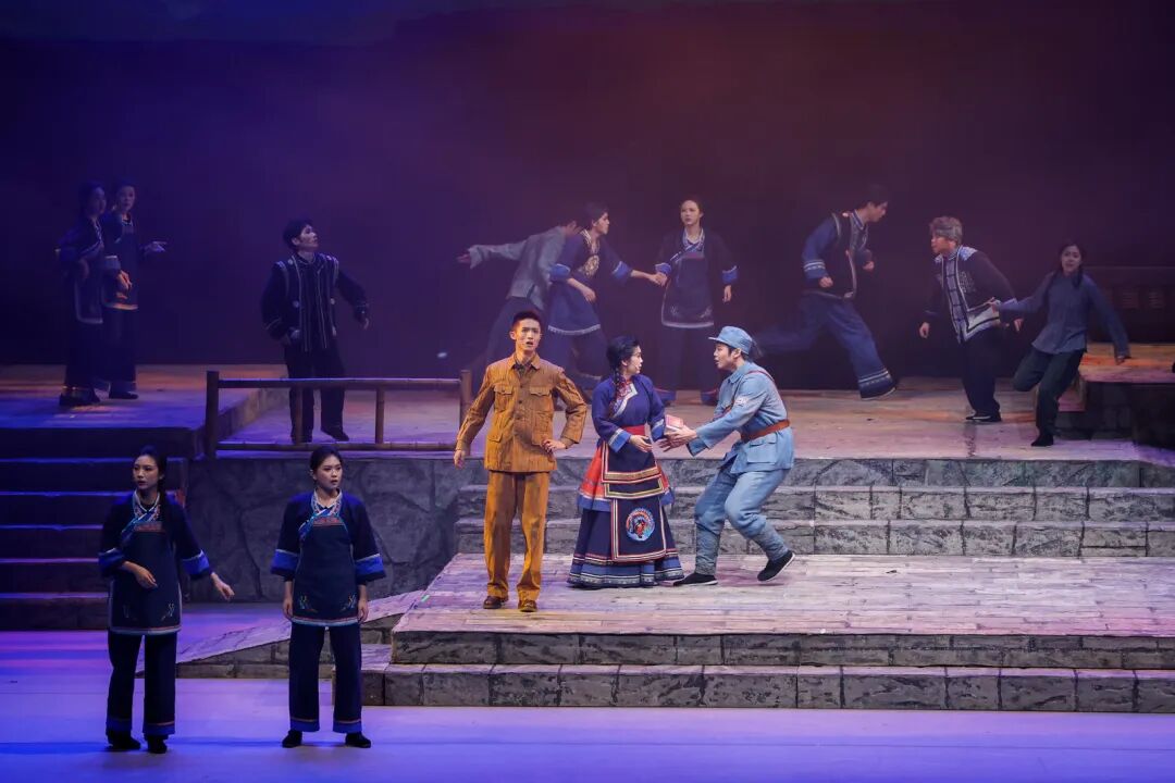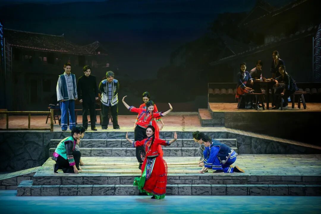 在藝術(shù)呈現(xiàn)上,作品巧妙運(yùn)用1944年與2025年雙時(shí)空交織的敘事結(jié)構(gòu),將畬族文化傳統(tǒng)、抗戰(zhàn)歷史記憶、英士大學(xué)辦學(xué)史與浙南山鄉(xiāng)獨(dú)特風(fēng)貌融入敘事。值得一提的是,作品深度融合畬族文化元素。劇中藍(lán)翠翠的唱腔保留了畬族山歌特有的顫音節(jié)奏,村民的集體舞蹈嚴(yán)格復(fù)刻了畬族“踏步擺腰”的傳統(tǒng)動(dòng)作,舞臺(tái)上的每個(gè)畫面都在訴說著濃濃的民族風(fēng)情。