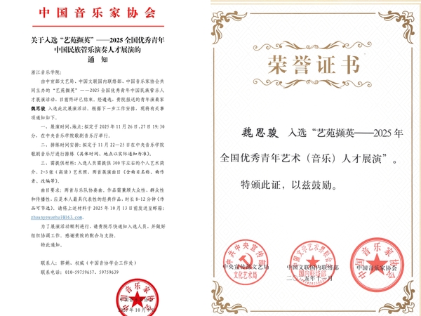 11月27日晚,由中宣部文藝局、中國文聯(lián)國內(nèi)聯(lián)絡(luò)部、中國音樂家協(xié)會共同主辦的“藝苑擷英”——2025全國優(yōu)秀青年中國民族管樂演奏人才展演第二場音樂會在中央音樂學(xué)院歌劇音樂廳精彩上演。學(xué)院國樂系青年教師魏思駿與7位優(yōu)秀青年演奏家,聯(lián)袂指揮家葉聰與中央音樂學(xué)院交響樂團(tuán),共同呈現(xiàn)了一場兼具藝術(shù)性與感染力的民族管樂盛宴。