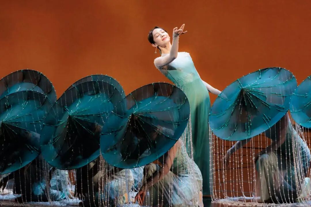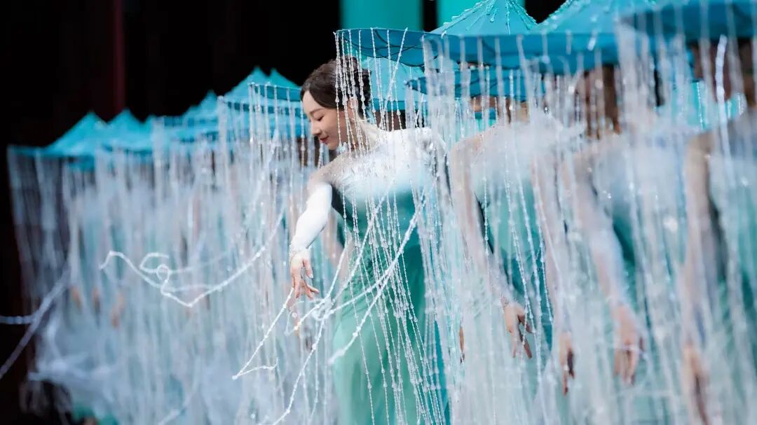 該作品以杜甫詩意為魂,以“雨”與“船”為眼,垂簾斗笠搖曳出斜風(fēng)細(xì)雨,步履如墨勾勒出青山遠(yuǎn)黛。舞者以小而細(xì)碎的動(dòng)作,展現(xiàn)出詩詞中對(duì)雨不同形態(tài)的描述,如“廉纖”“跳珠”“銀索”“斜風(fēng)細(xì)雨”等,在動(dòng)靜相宜間完成對(duì)江南品格的美學(xué)定幀。舞者們不斷變換隊(duì)形,展現(xiàn)如“輕舟”“屋檐”“遠(yuǎn)山”等中國古典意蘊(yùn)的詩意構(gòu)圖,讓這場(chǎng)跨越千年的春雨在當(dāng)代舞臺(tái)上“潤物無聲”。